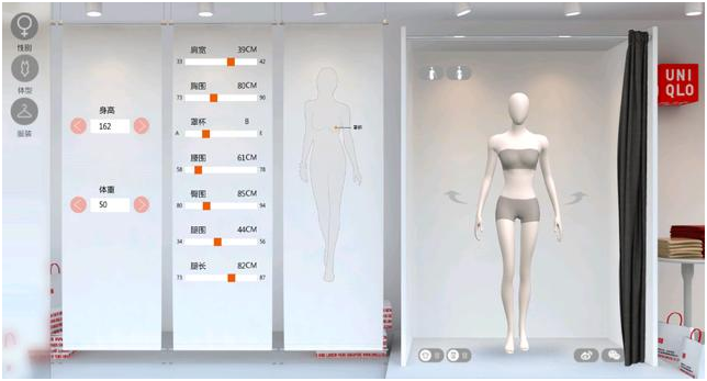 除了在商場等實體店的AR虛擬現(xiàn)實技術(shù)試穿系統(tǒng)外,京東、優(yōu)衣庫等商家也開辟了線上試衣間的功能。首先輸入顧客本人的身體參數(shù),在電腦上創(chuàng)造出一個對應(yīng)的虛擬形象;然后顧客就可以選擇有限數(shù)碼化的衣服進行試穿,并可以 360度查看試穿的效果。