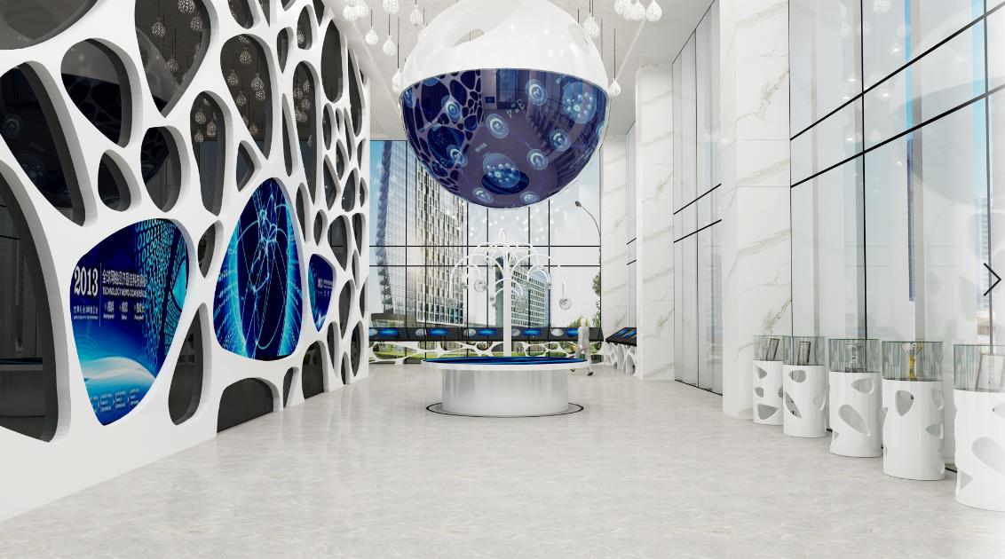 炫之風(fēng)以健康白為主色、科技藍(lán)為輔色,打造出一個簡約大氣的展示空間,融合異性LED屏、觸控一體機(jī)、全息展示臺、LED球等數(shù)字化展示手...